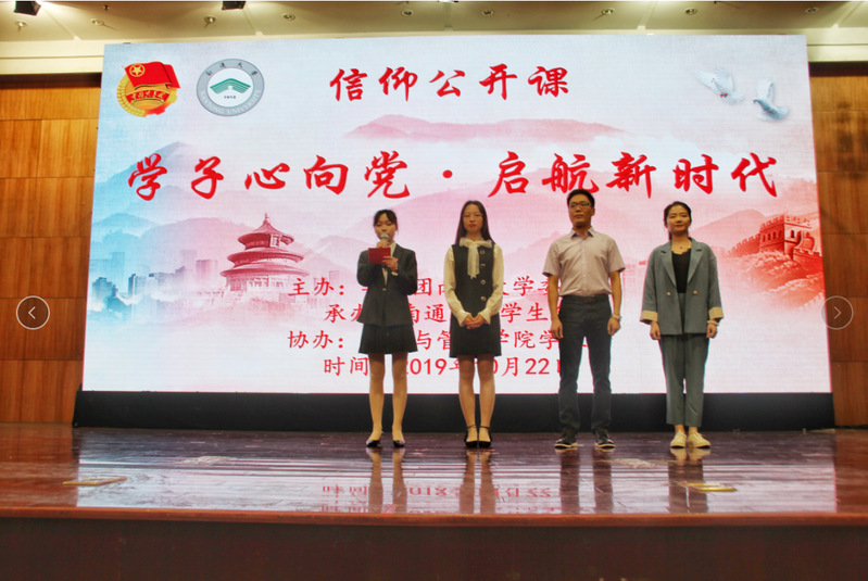 10月22日下午,由共青团球友会官网委员会主办,球友会官网员工会承办,经济与管理学院员工会协办的“学子心向党·启航新时代”信仰公开课在啬园校区老员工活动中心如期举办。经济与管理学院会计161班陈乃青,17级社会保障专业研究生臧凤夷担任主讲嘉宾,学院2019级全体员工参加了本次公开课。