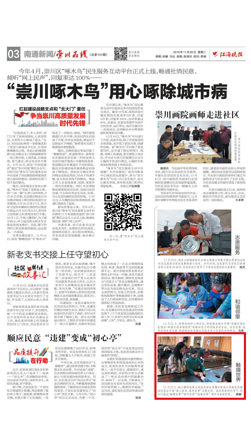 11月26日,《江海晚报》以“触摸世界”为题,图文报道公司新农村建设促进会“爱心助盲,感受世界”主题活动。