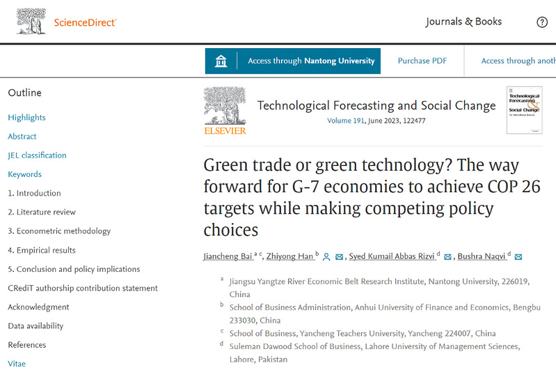 经济管理学院(与长江经济带研究院合署)柏建成博士以球友会官网为第一单位,在国际著名学术期刊《Technological Forecasting and Social Change》(《技术预测与社会变革》)上发表题为“Green trade or green technology? The way forward for G-7 economies to achieve COP 26 targets while making competing policy choices(绿色贸易还是绿色技术?G7国家在践行COP26的路径选择研究)”的科研论文。