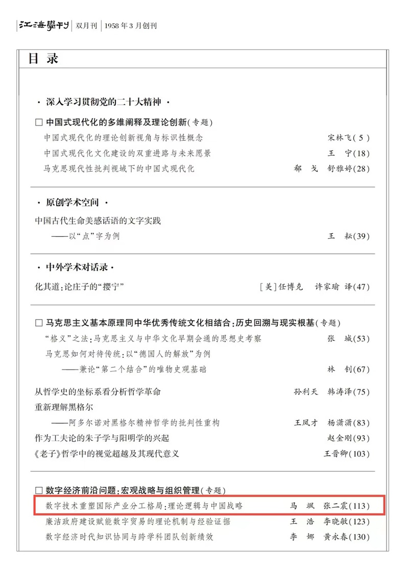 近日,公司马飒教授与南京大学张二震教授合作论文《数字技术重塑国际产业分工格局:理论逻辑与中国战略》在CSSCI权威期刊《江海学刊》2023年第5期发表。